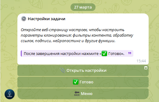 После этого бот начинает автоматически публиковать посты.