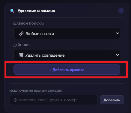 📌 Если элемент добавлен в белый список, бот не будет применять к нему правила удаления или замены.