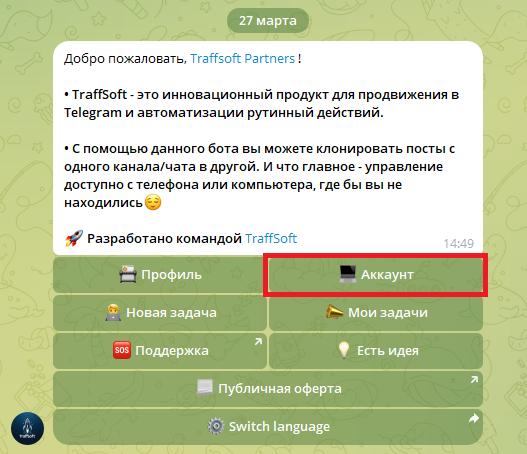 Перейдите в главное меню бота и нажмите кнопку «Аккаунт».